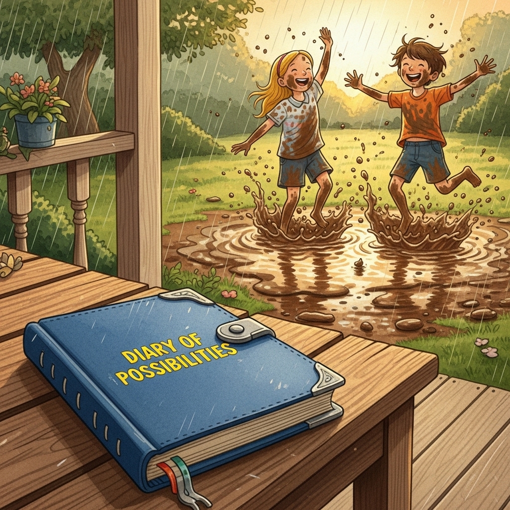 Eles riram. E, pela primeira vez nas férias, a aventura foi 100% real, suja, barulhenta e absolutamente perfeita. Alice aprendeu que o Diário das Possibilidades era poderoso, mas a imaginação dela era a verdadeira caneta mágica que podia reescrever qualquer dia chuvoso.